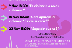 Es tracta d'uns tallers desenvolupats per Patricia Maguet Levy (Psicòloga clínica i terapeuta familiar), on es tractarà d'entendre de manera integral el concepte de la violència de gènere i les seves diverses i múltiples expressions, així com facilitar eines per a la seva prevenció i tractament.